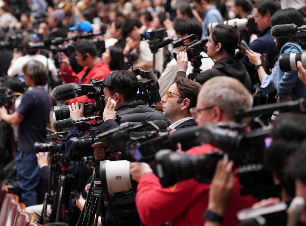 3月12日,十四届全国人大四次会议在北京人民大会堂举行闭幕会。这是记者在闭幕会上采访。
