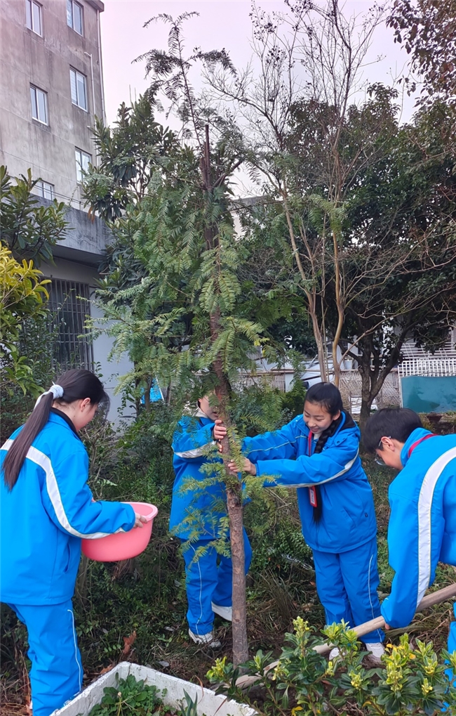 “小心,再小心一点!”同学们轻声细语,生怕惊扰了这场期待已久的相遇。挖坑、培土、浇水,每一个动作都饱含深情。当两棵红豆杉并肩而立,枝叶在晨风中轻轻摇曳,仿佛在互诉衷肠。这一刻,不仅是两棵树的相遇,更是一个“家庭”的建立,是生命对生命的温柔以待。