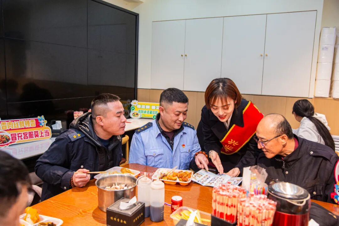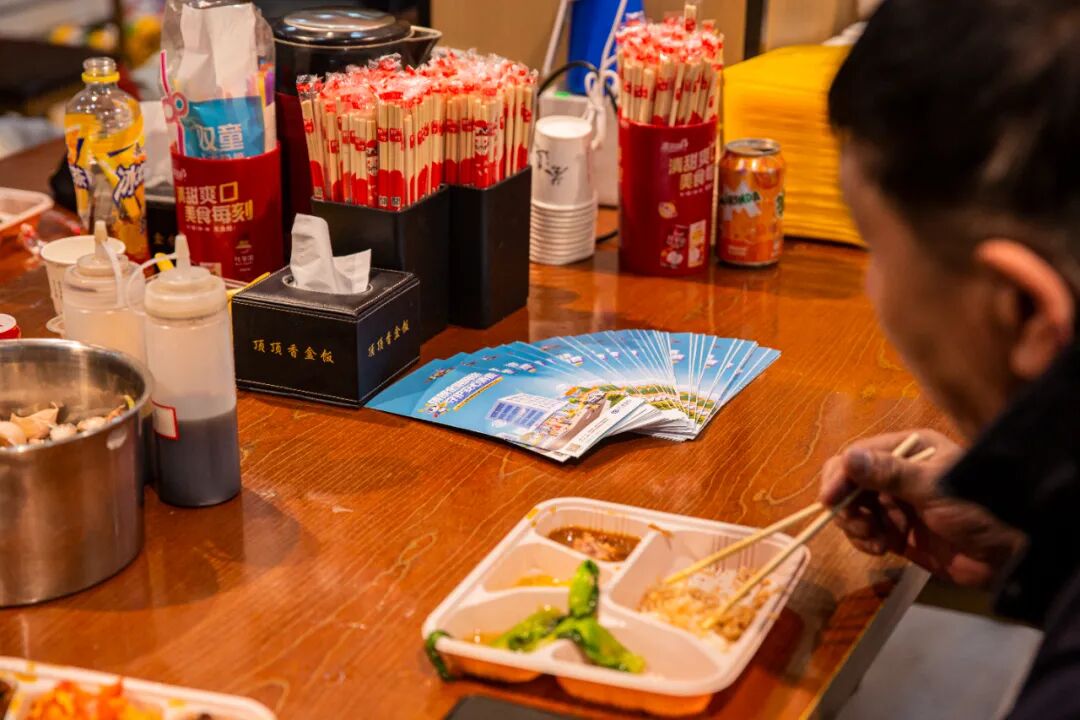 就餐间隙,食客们一边吃着热乎盒饭,一边交流诈骗案例,对照金融知识口诀认清骗子套路,让金融知识在烟火气的餐桌交流中自然传递,真正做到“金融教育伴三餐”。