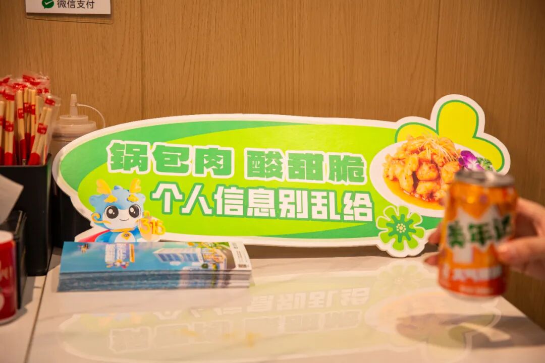 店内就餐区与取餐区,以菜品异形宣传牌装饰,锅包肉、地三鲜等经典东北菜旁,都配上了接地气的金融知识口诀,将反诈防骗、反洗钱、防范非法集资等核心知识融入美食,让食客在点餐间隙轻松记住防范要点,让金融宣传告别生硬说教。