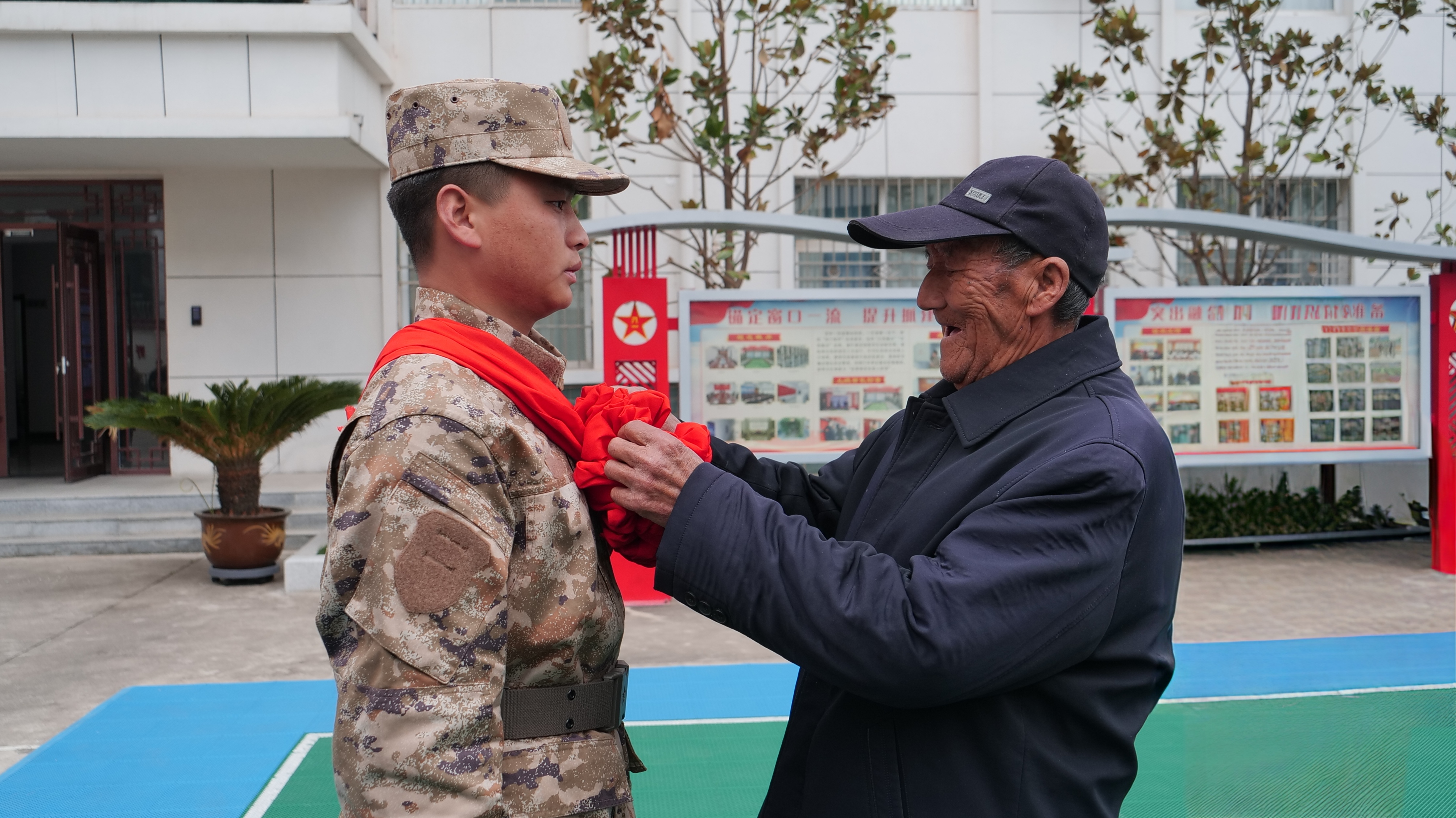 仪式现场,温情一幕令人动容。90岁的陈爷爷双手捧着自己连夜制作的大红花,缓步走到孙子身边。老人布满皱纹的手微微颤抖,认真地将红花系在新兵胸前。孙子紧紧抱住爷爷,眼眶微红,语气坚定地说:“爷爷,您保重身体,我一定在部队好好干,不辜负您的期望。”与此同时,身着校服的小学生们手捧鲜花,有序来到新兵队列前,献上最真挚的敬意,用纯真的祝福为即将奔赴军营的哥哥们送行。新兵们纷纷表示,一定不负重托、不负韶华,在军营苦练本领,以优异成绩回报家乡父老。