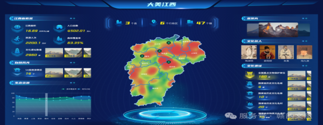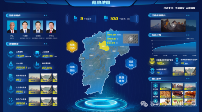 2.文旅历史模块展示江西各市县区的历史文化、名人故事、非遗产品等,支持图文、视频、音频等多种形式,增强用户体验,标注并详细介绍江西著名景点及其旅游路线、门票信息等,支持VR 全景展示、数字人导游,让用户 “云游” 江西。