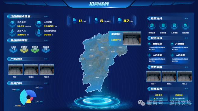 通过 “赣韵地图” 的招商板块,数字化全面展示江西省及各市、县区的基础设施情况、招商需求、政策优势、投资环境介绍、产业优势、招商负责服务人员和联系方式,建立线上线下结合的招商模式,形成长效的招商引资机制,为投资者提供一站式服务。投资者可以根据行业、区域等条件筛选项目,快速找到适合自己的投资机会;提升招商引资的效率和成功率;通过专业的招商服务和透明的信息展示,提升江西的营商环境形象,有效落实 “引资入赣” 方略。