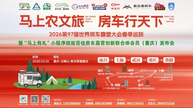 同时,我们隆重推出了“客乐得房车飞行营地”小程序,致力于打通“人·车·路·营地”全场景生态,未来将实现统一预订和异地借、修、还车,并积极争取银行、保险、ETC等行业的全面支持,为大家提供更便捷、更全面的服务。我们在2026年3月发布了首批自驾(房车)露营精品线路:南昌—九江—台州去野星球神仙居—上海—武汉318大本营—冷水石柱—重庆客乐得房车飞行营地—贵阳,并于3月8日开启了“马上农文旅,房车行天下” 2026第97届世界房车露营大会春季巡游活动,活动持续至3月31日,最终在贵阳参加旅发大会,全面展示江西魅力。