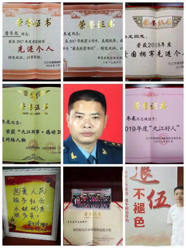 詹冬龙同志军旅生涯20年,六次荣立三等功,多次获评优秀基层主官、优秀机关干部;地方工作中获评优秀共产党员、优秀公务员、九江市新农村建设先进个人、都昌县“最美扶贫书记”;公益与道德领域获评九江首届十大爱心人物、感动九江2018网事人物、“九江好人”、九江市第四届道德模范、九江市爱国拥军模范、全国百强榜样公益人物(由全国人大代表张海荣推荐)。