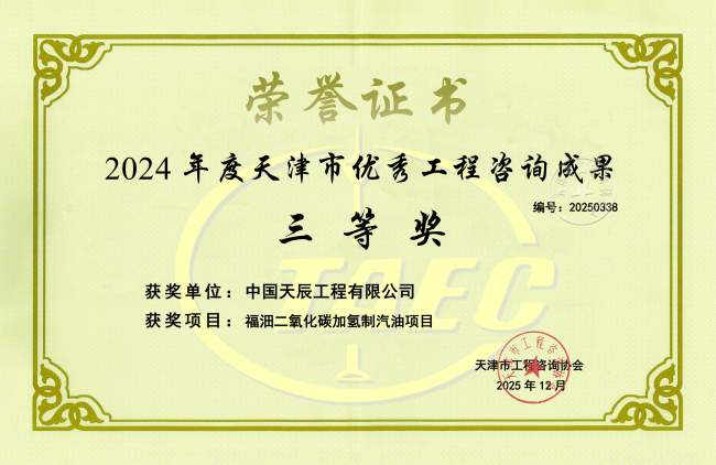福沺二氧化碳加氢制汽油项目荣获“2024年度天津市优秀工程咨询成果”三等奖。
