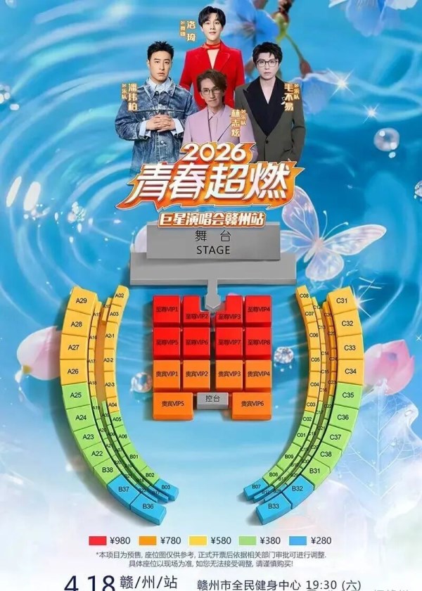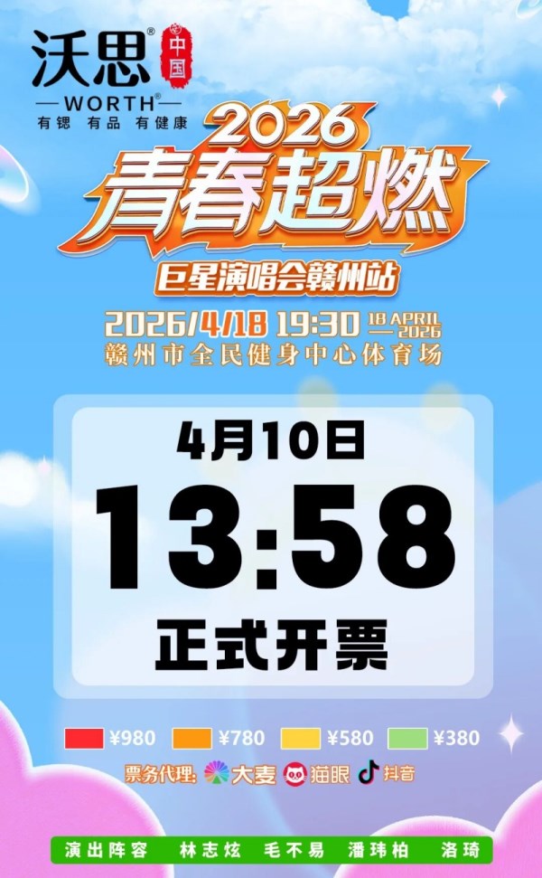 一次华语乐坛的实力碰撞,一场科技与音乐交织的青春狂欢——2026青春超燃巨星演唱会赣州站将于4月18日在赣州市体育中心体育场震撼开唱。4月10日13:58,门票将在大麦网、猫眼,抖音,线下指定同步开售。