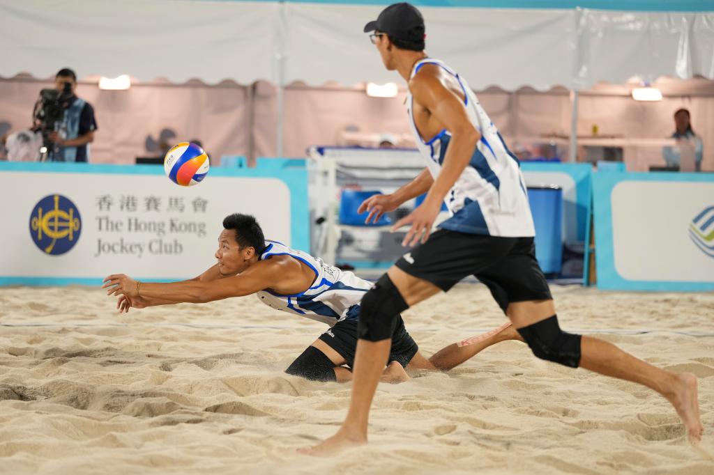 2025年11月10日,在香港举行的第十五届全国运动会沙滩排球男子比赛现场。新华社记者 吴鲁 摄