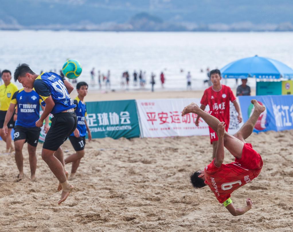 2025年10月17日,在浙江舟山进行的全国男子沙滩足球锦标赛现场。新华社记者 徐昱 摄