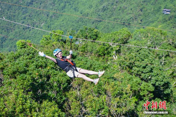 2025年11月14日,在海南三亚亚龙湾热带天堂森林旅游区,游客体验滑索。 中新网记者 骆云飞 摄