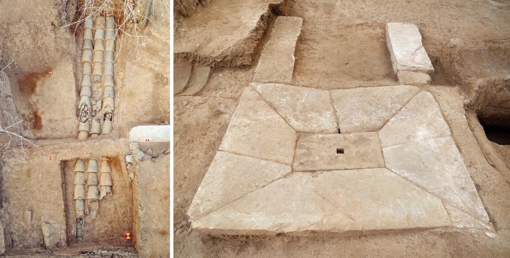 山东青岛琅琊台遗址山顶建筑基址发掘出土的排水设施(拼版照片)。