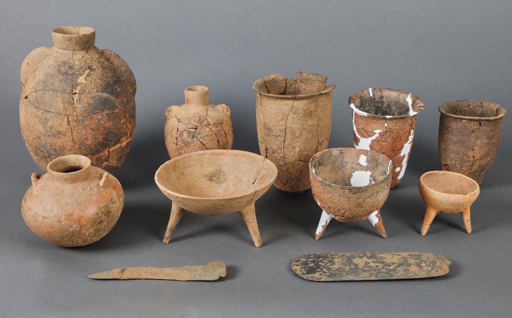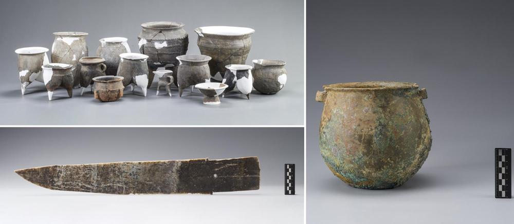 左上为河南郑州商城遗址西南部发掘出土的陶器组合;左下为河南郑州商城遗址东南部出土的玉戈;右为河南郑州商城遗址东南部出土的青铜汲水罐(拼版照片)。
